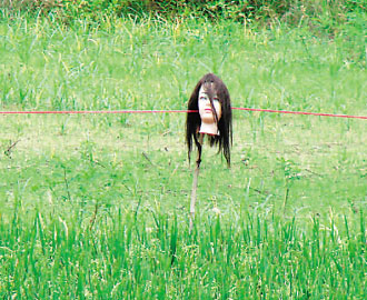 臺南縣新化鎮(zhèn)一處稻田以假人頭趕鳥,遠遠看像是披頭散發(fā)的女子頭浮在半空中。