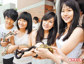 中國臺灣網6月16日消息 據臺灣《蘋果日報》報道,“。W校里有蛇!”臺南縣歸仁鄉(xiāng)長榮大學校內昨驚叫聲連連,原來是企管系大四男生卓佳逸帶來18條寵物蛇,秀給同學試膽。