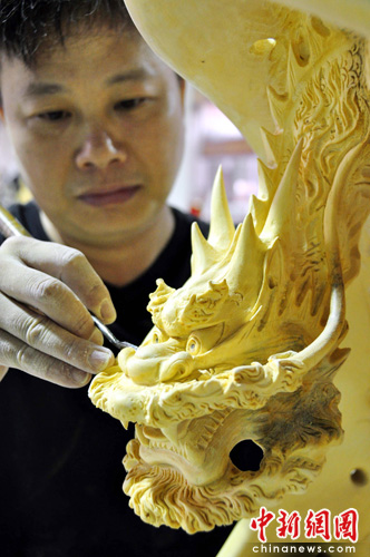 6月15日,來自臺灣的木雕高手官小欽在中國木雕現(xiàn)場創(chuàng)作大賽現(xiàn)場對作品《蛻變》中的一條龍進(jìn)行雕琢。6月6日至16日,第二屆中國木雕現(xiàn)場創(chuàng)作大賽在福建省莆田市舉行,來自臺灣、福建、山西、浙江、江西等地的25名木雕高手參加了比賽,現(xiàn)場創(chuàng)作最優(yōu)秀作品將獲得“獎元獎”。 林劍冰 攝