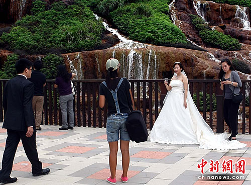 臺北縣九份一處自然風(fēng)光旅游景點(diǎn)上,6月23日一對新人在拍攝婚紗照。據(jù)悉,該縣有居臺灣之最的野柳女王頭、淡水漁人碼頭、皇冠海岸等自然風(fēng)光旅游景點(diǎn),目前當(dāng)?shù)芈糜尾块T正在盡力為游客提高旅游質(zhì)量做工作。中新社記者 宋吉河 攝