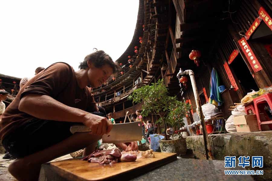 南靖(福建),2010年6月24日 南靖土樓——世界建筑史上的奇葩 生活在土樓里的居民準備做午飯(6月23日攝)。素有“土樓王國”之稱的福建南靖擁有各類土樓15000多座,其中田螺坑土樓群、河坑土樓群、懷遠樓、和貴樓被列入世界文化保護遺產(chǎn)名錄。近年來,福建南靖縣加強對土樓的保護與開發(fā),打造世界級旅游目的地。2009年南靖土樓以其獨特的文化和秀麗的自然環(huán)境吸引來自世界各地的游人近140萬。在有關(guān)部門和土樓人的保護下,歷史悠久的南靖土樓文化煥發(fā)出勃勃生機。 高學(xué)余攝