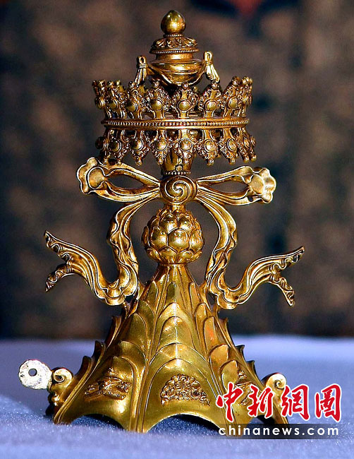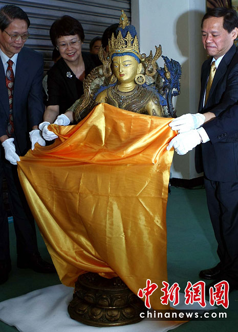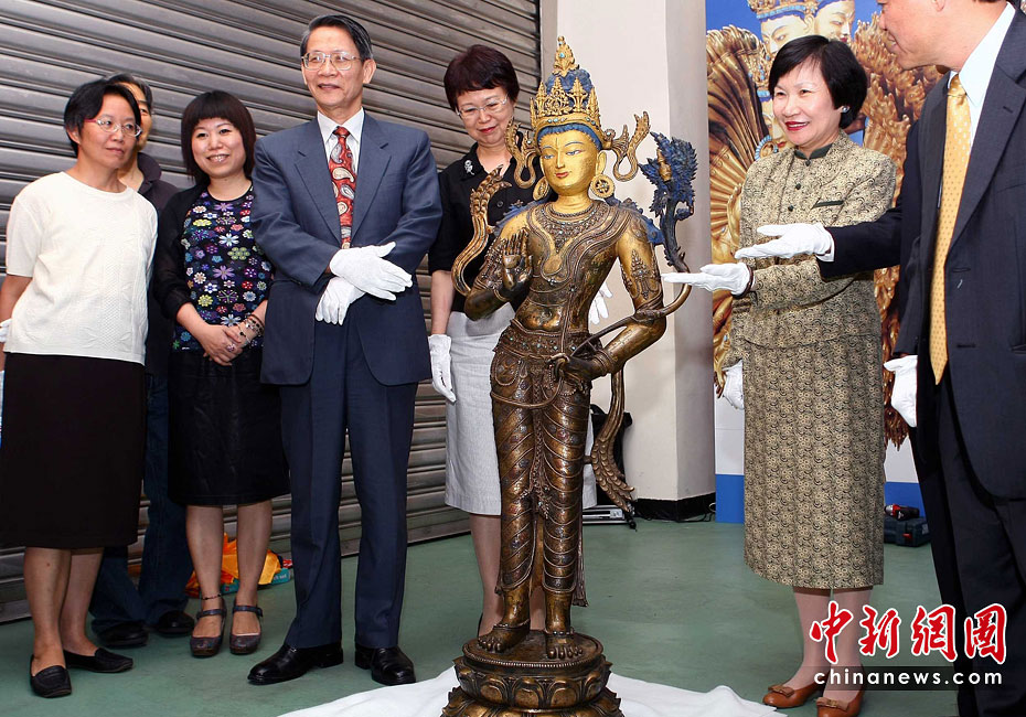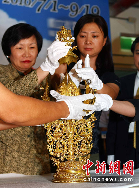 6月25日,工作人員將“鎏金銅彌勒菩薩像”、“金翅白海螺法號(hào)”、“八瓣蓮花曼荼鑼”等3件重量級(jí)文物開箱。7月1日,臺(tái)灣故宮博物院將舉辦“圣地西藏---最接近天空的寶藏”特展,展覽分“吐蕃王朝”、“金色寶藏”、“文化交流”、“雪域風(fēng)情”四部分,共有130組件文物參展。中新社記者宋吉河 攝