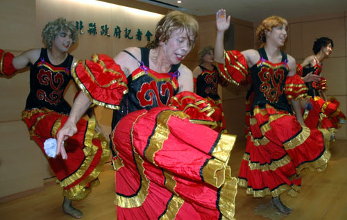 5名長者與3名替代役者反串的舞團,穿黑絲襪、戴金色夸張卷發(fā)及火紅蓬裙,熱情演出康康舞,舞姿撩人,嫵媚動感,在許多演出活動中獲得熱烈的反響。