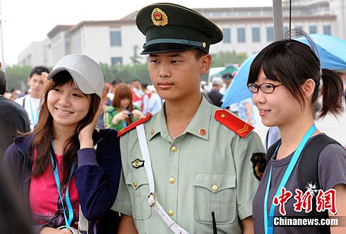圖為來(lái)自臺(tái)灣的同學(xué)們爭(zhēng)相與天安門(mén)廣場(chǎng)執(zhí)勤的武警戰(zhàn)士合影。劉震 攝