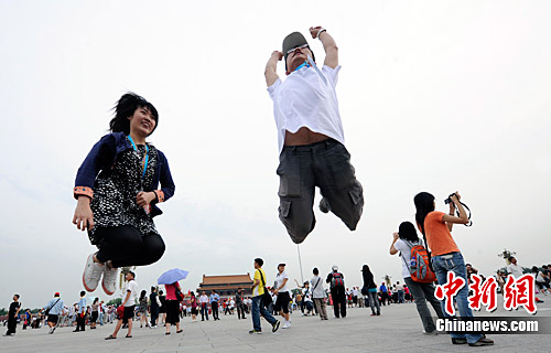 圖為臺(tái)灣的同學(xué)們?cè)谔彀查T(mén)廣場(chǎng)歡呼雀躍。 劉震 攝