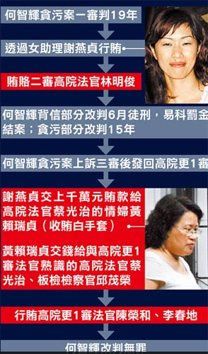 特偵組透露,何智輝為了不被關(guān),以自己的女助理謝燕貞當(dāng)行賄白手套,先行賄二審擔(dān)任受命法官的林明俊,林在何智輝所涉背信罪的部分,從一審判決2年到二審改判1年,然后適用2007年減刑條例,減為6個月,最后都獲易科罰金,貪污則改判15年。