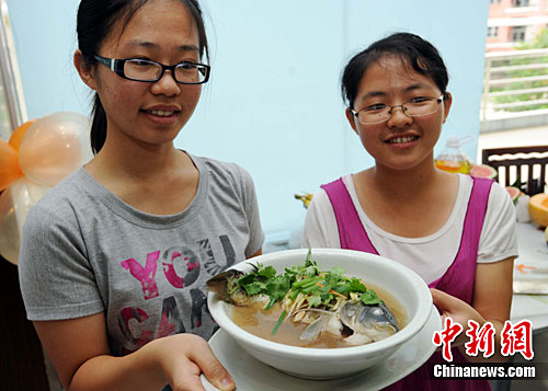 7月14日下午,參加“2010年海峽兩岸青年聯(lián)歡節(jié)·中醫(yī)藥傳統(tǒng)文化研習營” 藥膳大賽的福建中醫(yī)藥大學學生陳曉芳(右)與臺灣慈濟大學學生黃韻芹(左)齊心完成藥膳菜“當歸燉鯽魚”。由福建中醫(yī)藥大學、共青團福建省委、福建省臺灣同胞聯(lián)誼會聯(lián)合主辦的研習營為期兩周,開設有中醫(yī)藥文化、針灸學、養(yǎng)生藥膳、太極拳等課程。來自臺灣慈濟大學和臺灣嘉南藥理科技大學的32名學生及福建中醫(yī)藥大學的部分學生代表參加此次的研習營活動。中新社發(fā) 劉可耕 攝