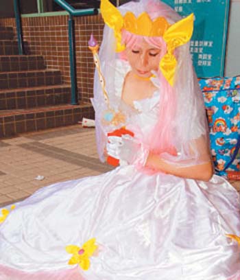 男生“斗天使”說,他中學(xué)時就喜愛“美少女戰(zhàn)士”,但當(dāng)時沒cosplay文化,想都沒想過能扮成喜愛角色;聽說cosplay后,他從變身系美少女開始,一直扮到神職系(巫女、修女等),這次則選擇扮演“結(jié)婚桃子”。