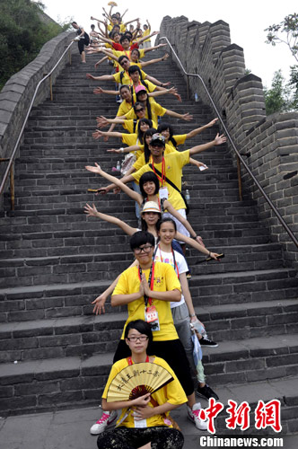 7月27日,2010年海外華裔及港澳臺(tái)地區(qū)青少年“中國(guó)尋根之旅”夏令營(yíng)部分營(yíng)員來(lái)到長(zhǎng)城游覽。圖為來(lái)自港澳臺(tái)的部分青少年興奮地在長(zhǎng)城上擺起“千手觀音”的造型留念。 劉震 攝