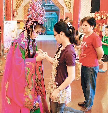 16日是農(nóng)歷七夕、中國傳統(tǒng)的情人節(jié),傳說這天是七夕娘娘的誕辰,在臺灣叫“七娘媽”,除了掌管人世間姻緣路外,更會照顧出生小孩平安長大。慈鳳宮昨天找人扮演七夕娘娘,在小提琴、薩克斯風(fēng)幽揚(yáng)樂聲伴奏下,為祈求姻緣的男女信眾戴上五色珠的紅絲線,希望求得好姻緣、夫妻幸福、小兒平安。