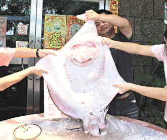 餐廳老板林慶昌表示,與餐廳配合的海釣船本月15日在恒春外海捕獲1條長158公分、寬76公分、重38斤的母魚,前半身像烏賊、后半身有長尾,但沒有刺,渾身柔軟,還有一般魚類少見的卵袋,他經(jīng)營海產(chǎn)餐廳多年,沒見過這種魚。