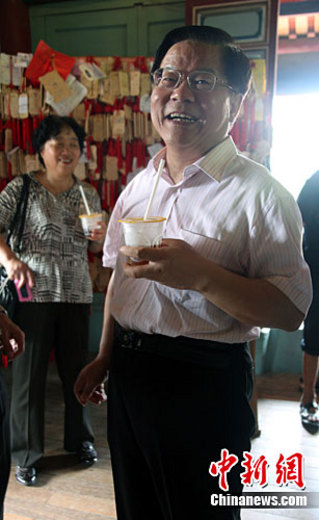 9月8日,中華文化聯(lián)誼會(huì)名譽(yù)會(huì)長(zhǎng)蔡武在臺(tái)南市參觀赤崁樓。圖為蔡武喝著當(dāng)?shù)孛癖娮畛R玫亩喜,觀賞歷史古跡。中新社記者 劉舒凌 攝