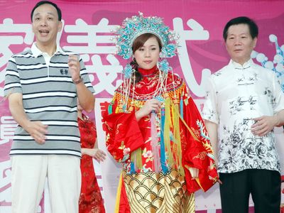 中國國民黨新北市長參選人朱立倫(左)12日表示,他對(duì)臺(tái)北市長郝龍斌有信心。圖為朱立倫出席,前臺(tái)灣省議會(huì)議長劉炳偉(右)的女兒劉美芳(中)新北市議員競(jìng)選總部成立儀式。 圖片來源:“中央社”
