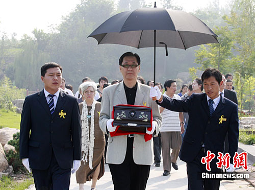 9月12日,臺灣著名作家柏楊骨灰在河南新鄭福壽園陵園下葬,實現(xiàn)了柏楊希望百年之后能夠葉落歸根,安息在中原故土的生前遺愿。圖為柏楊兒子郭本城移靈父親骨灰前往墓區(qū)。中新社記者 王中舉 攝
