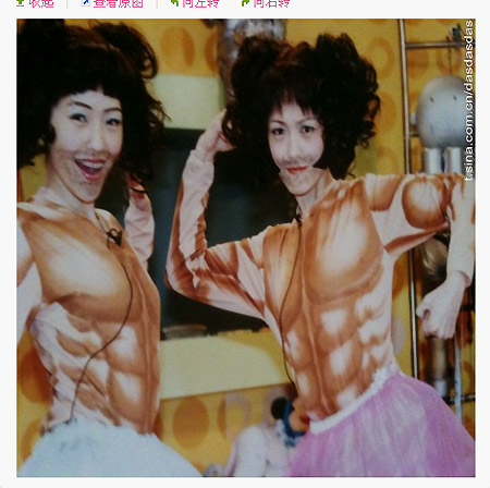 今天上午,大S在微博上表示,不知不覺(jué)自己微博人數(shù)破200萬(wàn),她決定貼張妹妹小S銷魂泳裝照慶祝一下。果然1張小S的照片出現(xiàn)在了大S的微博中,照片中的小S穿著連身泳裝,一臉稚氣的模樣,卻裝出嬌媚的神情,還雙手舉著隨風(fēng)飛揚(yáng)的白色披巾。此外,大S還預(yù)告將會(huì)放上一張“血脈噴張”的照片,結(jié)果過(guò)不久網(wǎng)友就看到她在微博上貼了一張名為“金剛芭比”的照片。這張照片是她和小S主持《娛樂(lè)百分百》時(shí)期爆笑裝扮,兩人都穿上“肌肉服”、畫(huà)上假胡渣、戴上爆炸假發(fā),搞笑功力十足。