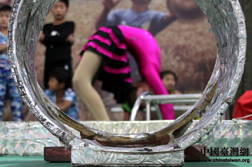 中國臺灣網(wǎng)9月25日河南消息 鉆圈、柔功、硬氣功、魔術(shù)……今天,濮陽東北莊雜技藝術(shù)團的孩子們?yōu)閮砂队浾叻钌狭司实难莩觥?/P>