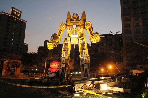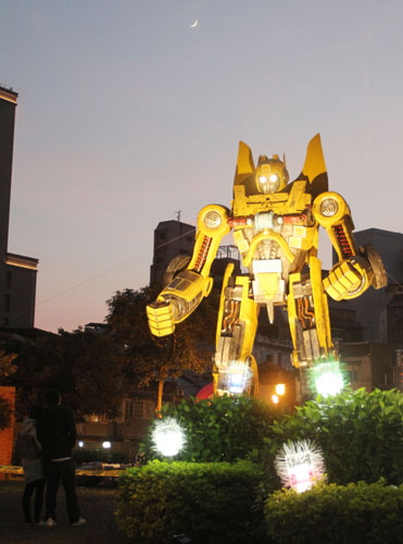 臺北市街頭9日出現1只變形金剛,原來是樂團“五月天”演場會上出現過的大型變形金剛模型,佇立在臺北市中華路與長沙街口展示。 圖片來源:“中央社”