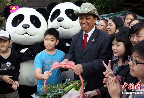 11月12日,臺(tái)北市文山區(qū)萬(wàn)興小學(xué)的學(xué)生們來(lái)到臺(tái)北市立動(dòng)物園的水田區(qū),親手收割他們今春在這里種下的茭白,并將其第一批收獲的新鮮茭白,送給生活在臺(tái)北市立動(dòng)物園內(nèi)的大熊貓“團(tuán)團(tuán)”“圓圓”嘗鮮。