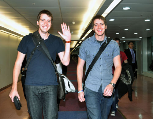 電影《哈利波特》系列首度有演員造訪臺(tái)灣,片中飾演榮恩雙胞胎哥哥的詹姆斯(右)與奧立佛·菲爾普斯(左),15日上午抵臺(tái)。 圖片來源:“中央社”