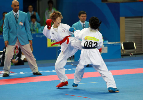 廣州亞運會24日下午進(jìn)行空手道女子50公斤級銅牌戰(zhàn),中華臺北隊選手陳彥卉(中)對決韓國選手張昭英(右),雙方使盡全力拼戰(zhàn),氣氛相當(dāng)火爆。 圖片來源:“中央社”
