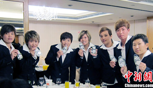 11月29日晚,臺灣有關(guān)方面在臺北為參加2010年第16屆廣州亞運會的中華臺北體育代表團舉行慶功餐會。會上,該次亞運上的中華臺北金銀銅牌全體得主分別獲贈由臺灣大洋金幣公司提供的廣州亞運主題金銀紀念幣和熊貓團團圓圓紀念銀幣,共217枚總值80萬多元新臺幣。圖為運動員在展示受贈的紀念幣。