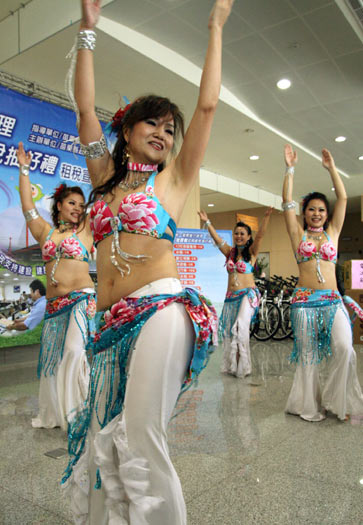 臺灣苗栗縣中東肚皮舞推廣協(xié)會成員多是客家媳婦,她們?nèi)涨吧碇灾瓶图一ú嘉枰,參?010 Nefertiti國際杯肚皮舞大賽,贏得業(yè)余團(tuán)體組冠軍。圖片來源:“中央社”