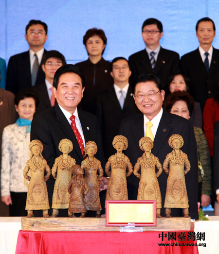 12月21日下午,海協(xié)會(huì)會(huì)長陳云林與;鶗(huì)董事長江丙坤正式簽署《海峽兩岸醫(yī)藥衛(wèi)生合作協(xié)議》,雙方并在協(xié)議簽署后互贈(zèng)禮品。圖為海協(xié)會(huì)致贈(zèng)海基會(huì)方面的雕塑作品《好事連連》。(中國臺(tái)灣網(wǎng) 鐘寶華 攝)
