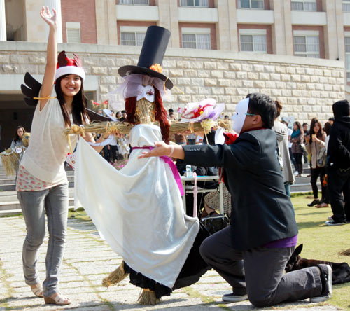 據(jù)報(bào)道,亞洲大學(xué)創(chuàng)意設(shè)計(jì)學(xué)院22日舉辦一場別開生面的稻草人選美走秀活動。院長賴淑玲表示,“稻草人也可以很酷,很漂亮”,學(xué)校附近很多稻田,秋收后,常見稻田中孤單稻草人,2010年特別在11月底發(fā)動學(xué)生撿拾稻草回來曬干,并制作稻草人,利用學(xué)生創(chuàng)意把稻草人變美了。