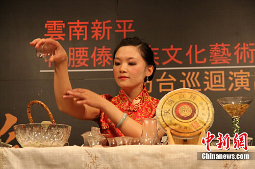 1月12日,“七彩云南·文化驚艷”民族文化交流訪問(wèn)團(tuán)在臺(tái)北舉行記者會(huì)透露,該訪問(wèn)團(tuán)將于近日在臺(tái)灣正式演出9場(chǎng),交流演出3場(chǎng),并有數(shù)場(chǎng)座談會(huì),展演地點(diǎn)包括臺(tái)北等縣市。圖為一名來(lái)自云南的茶藝師正在進(jìn)行茶藝表演。中新社記者 甘娜 攝