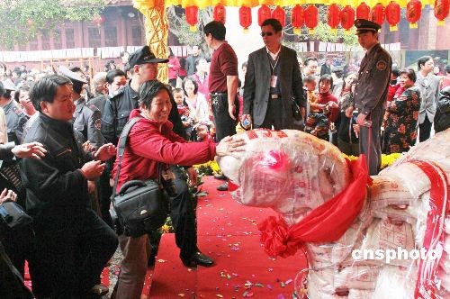 資料圖:二零零八年二月二十二日,福建泉州天后宮舉行熱鬧的傳統(tǒng)民俗“平安乞龜”活動(dòng)吸引大批市民。十噸袋裝大米制成的“乞龜”長7米,寬近5米,撫摸其頭頂則有平安祝福的美好寓意。 中新社發(fā) 傅丹丹 攝