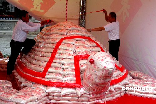 資料圖:二零零七年三月一日,在泉州天后宮廣場內(nèi),兩位來自臺(tái)灣澎湖縣的“米龜”制作師傅正在為“米龜”做最后的修繕工作。這只“米龜”共由一千兩百袋、六千公斤平安米筑成,屆時(shí),澎湖“乞龜”祈福的民俗表演將首次在泉州展現(xiàn)。 中新社發(fā) 傅丹丹 攝