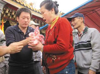 新北市土城區(qū)永福巖清水祖師廟顧問劉湘麟,將神豬肉分送給排隊民眾。圖片來源:臺灣《聯(lián)合報》
