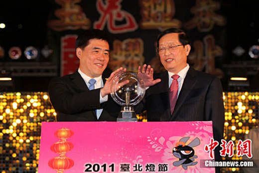 2月17日晚,作為2011臺北燈節(jié)特別活動,“關東風情”在雨中閃亮登場。圖為遼寧省長陳政高(右)與臺北市長郝龍斌一起觸摸啟動道具魔球,啟動焰火及兩岸民俗表演。中新社記者 董會峰 攝