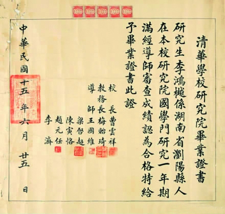 這4位導(dǎo)師確實(shí)是當(dāng)時(shí)清華大學(xué)中文院的4大導(dǎo)師,清華中文院當(dāng)時(shí)也只有這4位導(dǎo)師。四位大學(xué)問(wèn)家負(fù)責(zé)指導(dǎo)全院的學(xué)生,因此中文院研究生的畢業(yè)證書上都印著他們的名字。