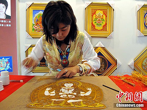 經(jīng)過半年的籌備,“2011青海文化周”5月19日在臺北101大樓展演廳開幕,將為臺灣民眾獻上一系列精彩的民間藝術(shù)文化展演。來自青海的熱貢繪畫、掐絲唐卡、手繪唐卡、昆侖玉雕、剪紙、民族歌舞服飾表演,以及民間藝術(shù)大師的現(xiàn)場才藝展示等等,為前來參觀的民眾展示了豐富多彩的民族文化風(fēng)情。圖為青海民間手工藝人在現(xiàn)場表演掐絲唐卡的制作工藝。中新社發(fā) 路梅 攝