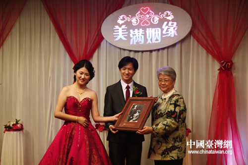 北京姑娘王菲和臺(tái)北小伙何承諺在一場(chǎng)兩岸青年的交流活動(dòng)中相遇相識(shí),經(jīng)過(guò)四年愛情長(zhǎng)跑于9月25日邁入婚姻殿堂,圖為中國(guó)宋慶齡基金會(huì)副主席唐聞生向菲菲、承諺贈(zèng)送孫中山、宋慶齡結(jié)婚照。(中國(guó)臺(tái)灣網(wǎng) 徐維彬 攝)