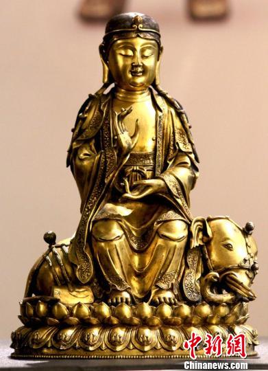 11月3日,“智慧華嚴(yán)——北京首都博物館佛教文物珍藏展”記者會(huì)今天在臺(tái)北舉行。圖為今天開箱的“普賢菩薩”像,此像頭戴發(fā)箍,頭發(fā)后梳并結(jié)辮垂肩,面相寬大飽滿,神態(tài)慈和寧?kù)o。上身披袈裟,下身著僧裙,衣紋寫實(shí),衣緣上刻有精美花紋。善跏趺坐于象背,雙手置胸前結(jié)印。象臥于蓮花座上,象嘴露出六牙。蓮座后刻有銘文:“大明嘉靖十一年正月初八日父諱日男陳佐發(fā)心追造!痹煨投饲f,做工精細(xì),品相完好,為明代晚期造像難得精品。陳立宇 攝