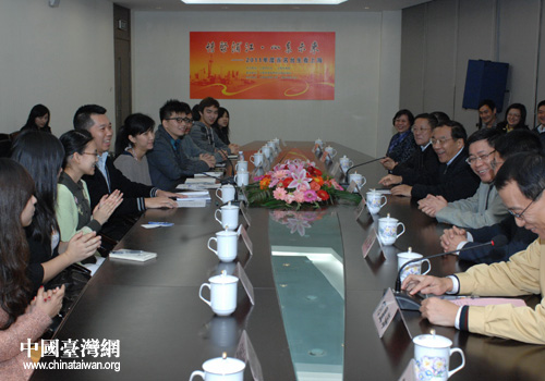 上海市委常委楊曉渡等領(lǐng)導(dǎo)與臺灣學(xué)生座談(上海市臺辦 葛鳳章 攝)