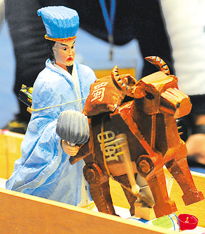 四川成都紅磚西路小學(xué)學(xué)生制作的“諸葛亮木牛流馬”在參加直線競賽。