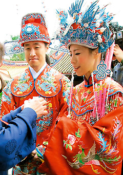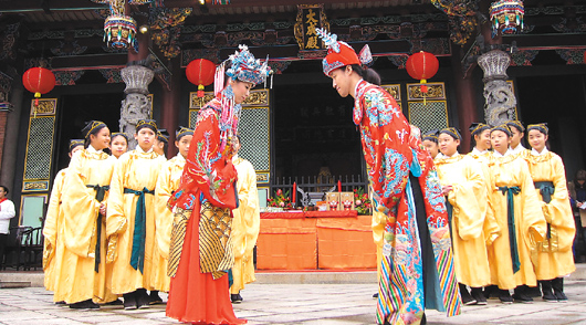 中國(guó)臺(tái)灣網(wǎng)12月25日消息 據(jù)臺(tái)灣《聯(lián)合報(bào)》報(bào)道,臺(tái)北市孔廟昨天破天荒舉行儒家婚禮,在臺(tái)灣民政部門負(fù)責(zé)人黃呂錦茹主證婚下,曾在孔廟擔(dān)任禮生的日本籍新郎水口拓壽,迎娶臺(tái)灣美嬌娘簡(jiǎn)秀文。未來(lái)孔廟也將以此為藍(lán)本,開放民眾申請(qǐng)儒家婚禮。