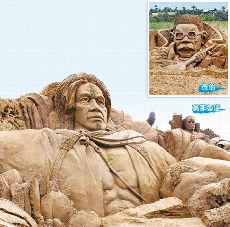 中國臺灣網(wǎng)1月8日消息 據(jù)臺灣《蘋果日報》報道,“2012年南投貓羅溪沙雕藝術節(jié)”昨天在風景優(yōu)美的南投市貓羅溪畔登場,臺灣賣座電影《賽德克巴萊》、《臥虎藏龍》、《艋舺》、《海角七號》中的經(jīng)典形象被制作成大型沙雕。(中國臺灣網(wǎng) 李迪)