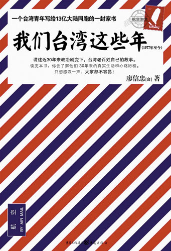 2009年初冬,一個臺灣青年寫給13億大陸同胞看的一封家書《我們臺灣這些年》風(fēng)靡大陸,銷售火爆,作者透過自己的人生經(jīng)歷,以年份為坐標(biāo),從1977年自己出生的那年開始,以輕松文筆向大陸讀者介紹自己所認(rèn)識的臺灣社會和政治。已在而立之年的作者用淺顯的手法,講述30年來臺灣政治巨變下老百姓自己的故事。正如該書封面說言:讀完本書,你會了解臺灣人30年來的真實生活和心路歷程。只想感嘆一聲:大家都不容易!