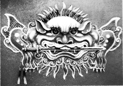 劍獅圖案源自閩南的民間避邪物,歷史上廣泛流傳于海峽兩岸。臺(tái)南安平是臺(tái)灣西部沿岸港口城市,為三面臨海沙嶼,是早期大陸移民最多的聚居地,因地狹人稠,住宅櫛比而立,巷道狹小,民居檐角交錯(cuò)而建,當(dāng)?shù)鼐用駷槠平饨ㄖL(fēng)水上的忌諱,遂在門(mén)面或門(mén)檐、照壁,裝飾了諸如劍獅、獅面等避邪之物。