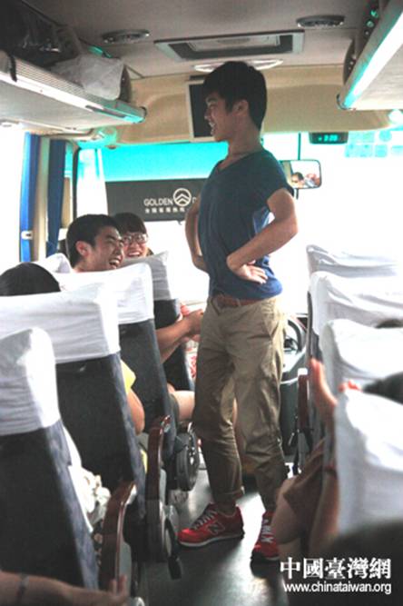前往蘇州的路上,來自臺(tái)北教育大學(xué)的陳昱達(dá)在車上表演舞蹈。(中國(guó)臺(tái)灣網(wǎng) 孟雅詩(shī) 攝)