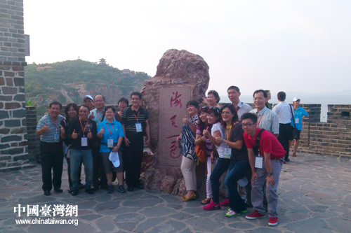 “2012海外臺(tái)商齊魯行”的成員們?cè)谂钊R閣留影。(圖片來(lái)源:煙臺(tái)臺(tái)辦)