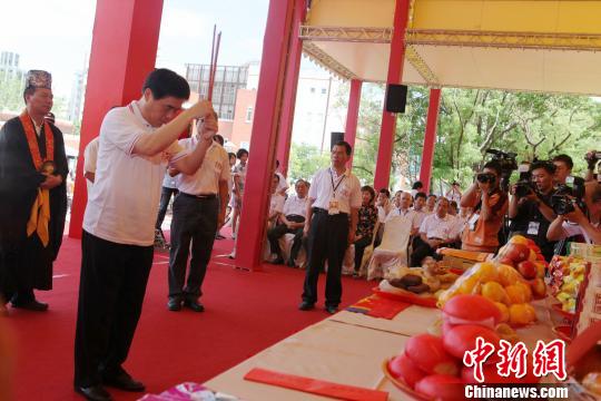 10月13日上午,為期3天的2012臺(tái)北客家義民嘉年華在臺(tái)北市客家文化主題公園開幕。圖為“安座大典”上,臺(tái)北市長(zhǎng)郝龍斌作為主祭官,在神壇前上香,敬拜義民爺。楊杰 攝