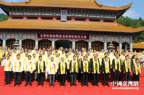 參加祭祀活動(dòng)的兩岸嘉賓代表于神農(nóng)大殿前合影。(中國(guó)臺(tái)灣網(wǎng) 陳睿 攝)