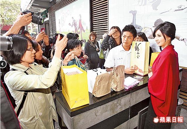 斕曦(右)昨(7)在臺(tái)視門口路邊搭臺(tái)子,和粉絲簽名拍照。 (圖片來自臺(tái)媒)