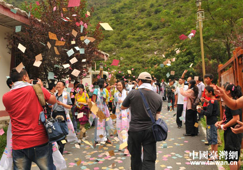 兩岸媒體記者進入芝麻南岸村受到當(dāng)?shù)夭刈迦罕姛崃覛g迎。(圖片來源:四川省臺辦)