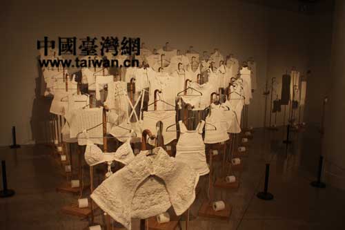 “交互視象——2013海峽兩岸當(dāng)代藝術(shù)展”在中國美術(shù)館亮相,大陸藝術(shù)家的作品“戰(zhàn)利品”是用手紙和報(bào)紙制作的(中國臺灣網(wǎng) 蕪?fù)?攝)